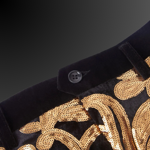 The Gold Velvet Royal Suit is designed for men who command presence. Featuring an intricate black-and-gold sequin pattern, this two-piece set blends elegance with bold sophistication — ideal for weddings, celebrations, evening events, and upscale parties.